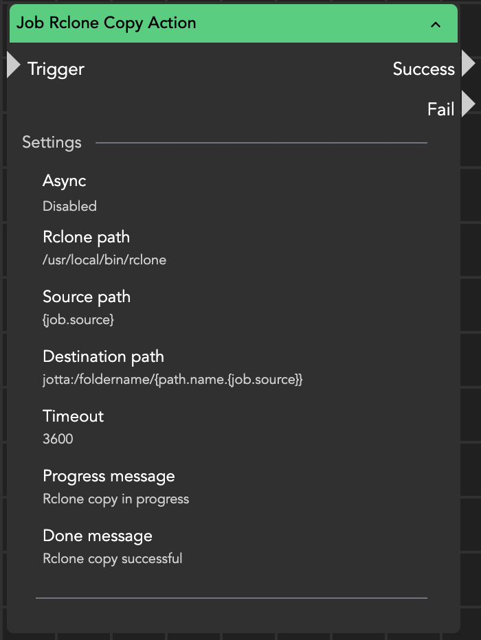 With the help of the job RClone Copy Action it is possible to copy assets or folders to a remote location. In order for this to be possible, RCLone must be installed on the workstation on which this node (within a stream) is running. The path to the Executbale is given in the node, but can also be freely defined. The configuration of the remote location must be done via RClone itself. See the documentation for RClone. The name of the remote location can be defined when creating the remote location in RClone and must be specified in the node.