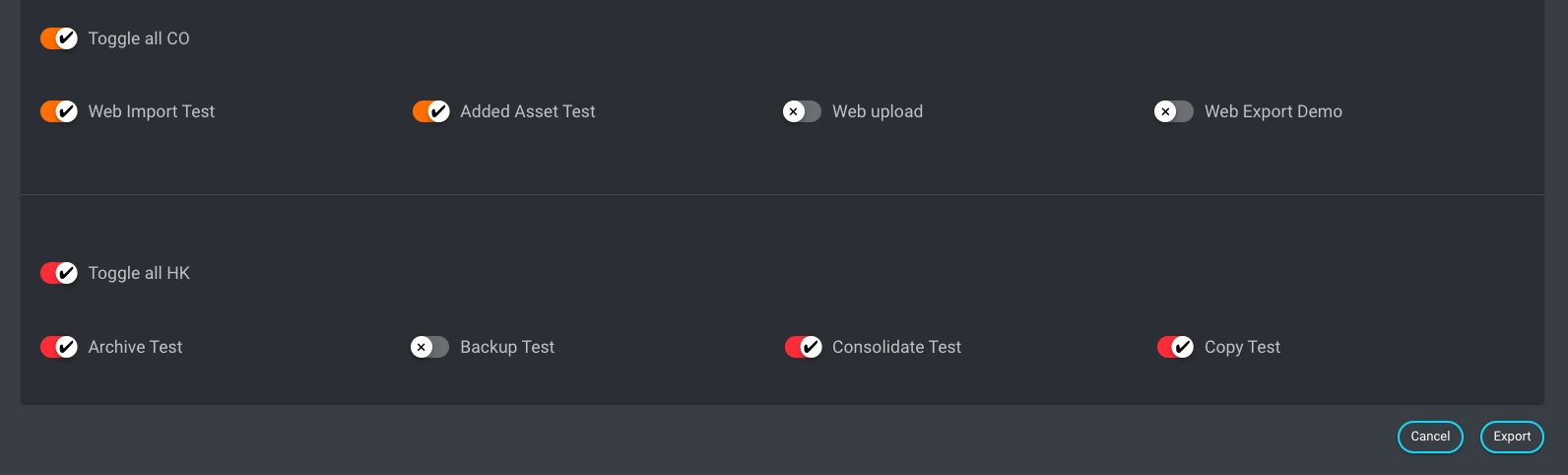 Within the dialog, users can toggle the desired streams for each application (FX, IO, CO, HK), and these selected streams will be included in the export.