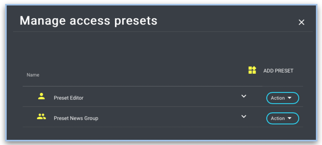 Clicking the 'Access Presets' button will open an overlay window that manages all User and Group Access Presets.