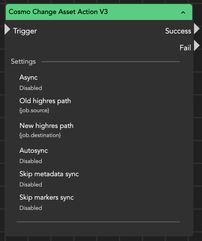 With the help of the Cosmo Change Asset Action it is possible to change the path of a file in Cosmo globally. For example, if a file is moved (archive) via a housekeeper workflow, the new storage location can be made known and, if the Autosync function is activated in the node, it can also be automatically reset in all premiere projects (after the project has been opened).