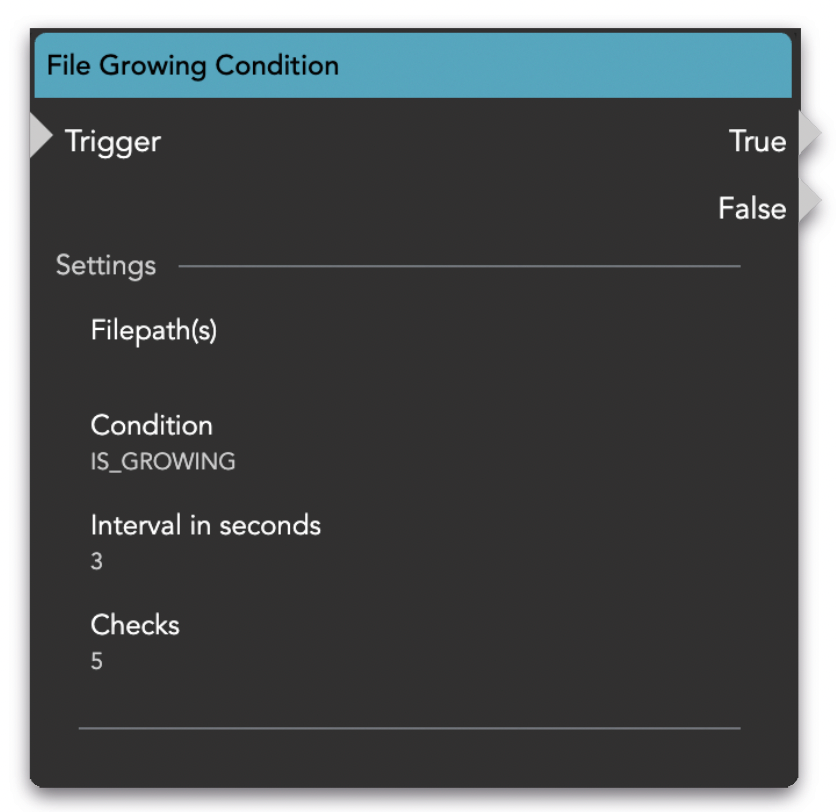 The node will check the file size in the defined interval, if the file size does not change for the amount of set Checks, the file is set as not growing" If the file size changes between the checks, it is set as growing. The node will not check infinitely, it is just meant to define the current state of a given file.