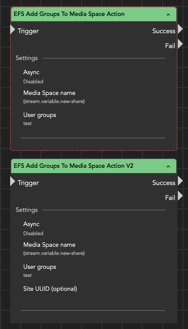 The functionality has been expanded, as illustrated in the screenshot below for the [EFS Add Groups to Media Space](https://docs.helmut.de/helmut4-releases/v4.8.0/helmut4-components/streamdesigner/nodes/actions/third-party/editshare/editshare-file-system/efs-add-group-to-media-space-action) action, which now includes a Site UUID field.