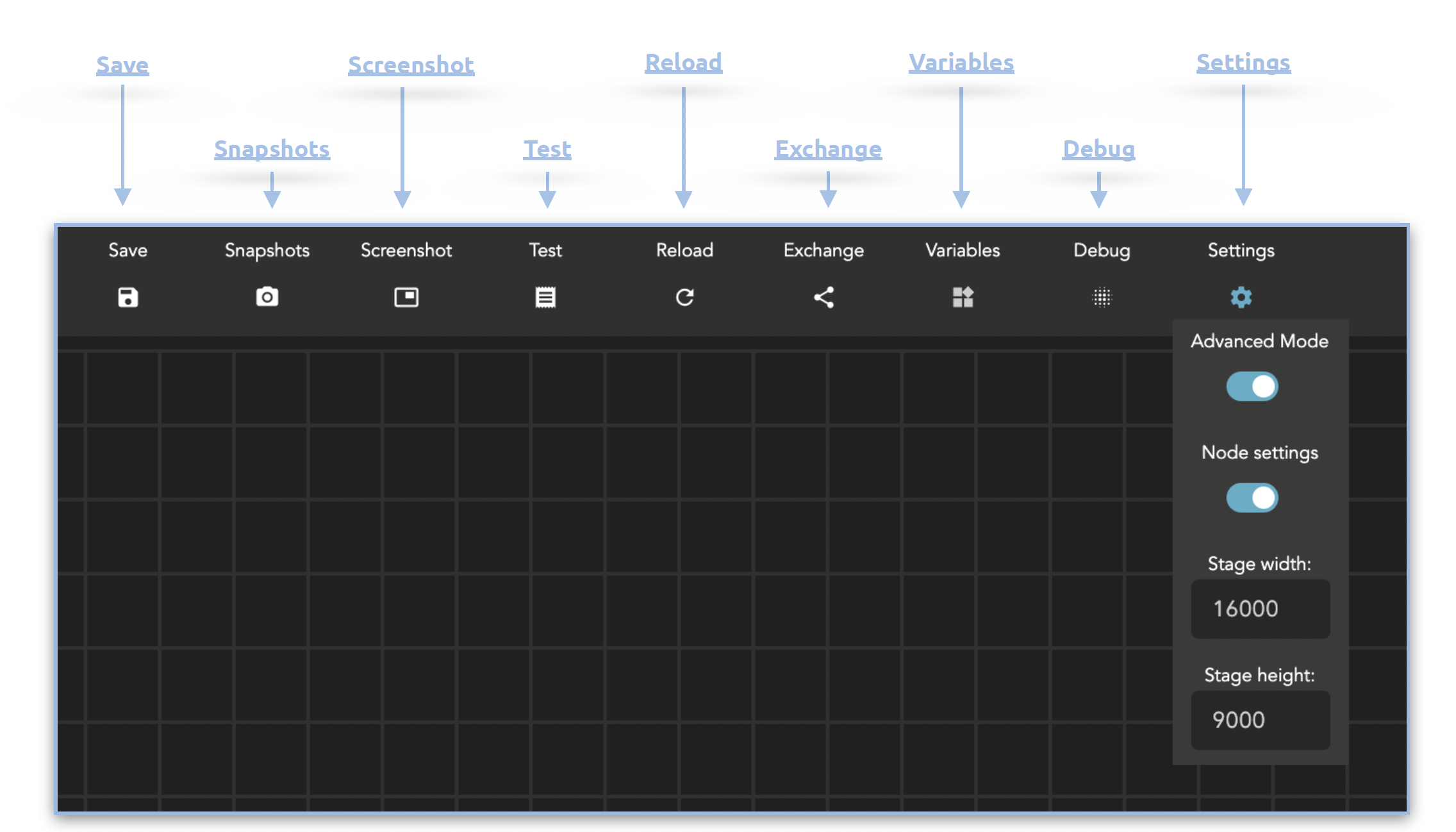 Creates a screenshot of the stage that is holding all your nodes (available in Chrome only). The Size of the screenshot is related to the stage width and height which can be defined under “Settings”.