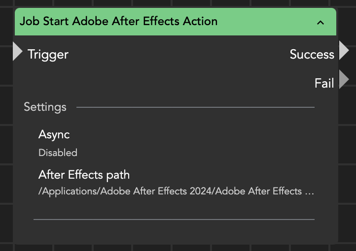 <figure><img src="https://3962491119-files.gitbook.io/~/files/v0/b/gitbook-x-prod.appspot.com/o/spaces%2FcEm1TSe9cbcIGVFLrAGo%2Fuploads%2FSJMJm7WONONBuz1UGcjW%2Fimage.png?alt=media&#x26;token=78073c59-a854-40ce-8eda-bfce29a824e8" alt="" width="361"><figcaption><p>Job Start Adobe After Effects Action</p></figcaption></figure>