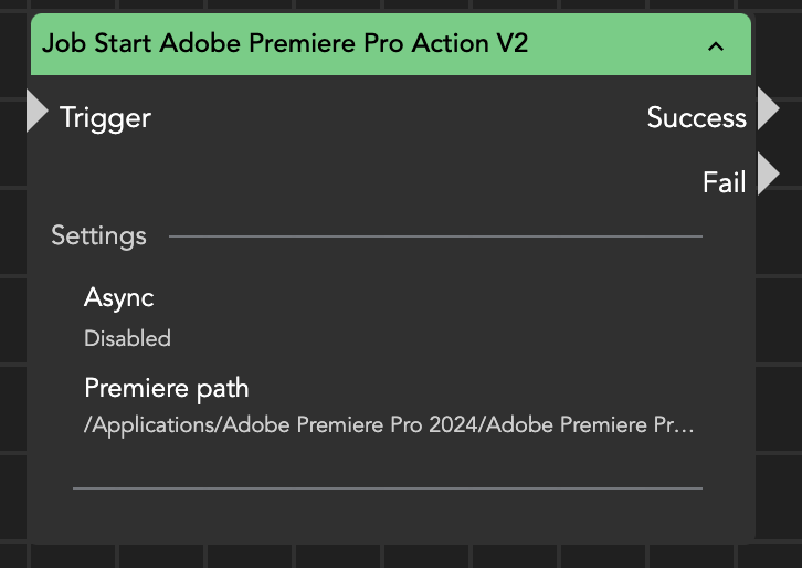 <figure><img src="https://3962491119-files.gitbook.io/~/files/v0/b/gitbook-x-prod.appspot.com/o/spaces%2FcEm1TSe9cbcIGVFLrAGo%2Fuploads%2Fgxyd018IreqpmAH40neY%2Fimage.png?alt=media&#x26;token=6a57282a-f0f1-46d2-8bba-04ac1bbc8c02" alt="" width="363"><figcaption><p>Job Start Adobe Premiere Pro Action</p></figcaption></figure>