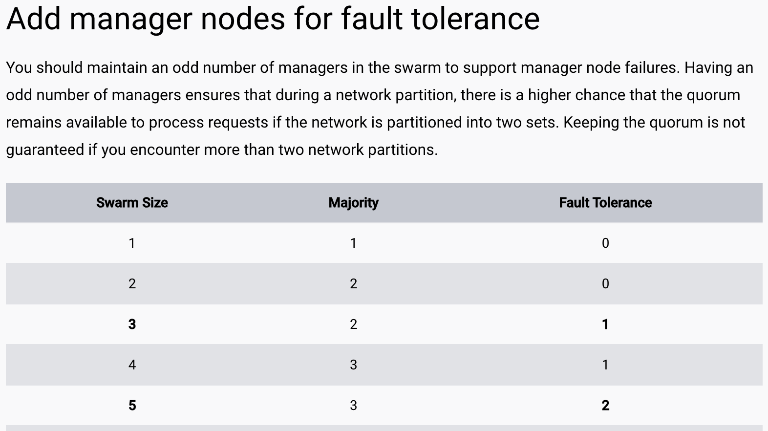 <figure><img src="https://content.gitbook.com/content/SQcKMi1ekwU1M8tCIPPd/blobs/egcVZdBhLx4ksZKwTPDC/image.png" alt=""><figcaption><p>Docker swarm - fault tolerance<br><a href="https://docs.docker.com/engine/swarm/admin_guide/#add-manager-nodes-for-fault-tolerance">https://docs.docker.com/engine/swarm/admin_guide/#add-manager-nodes-for-fault-tolerance</a></p></figcaption></figure>