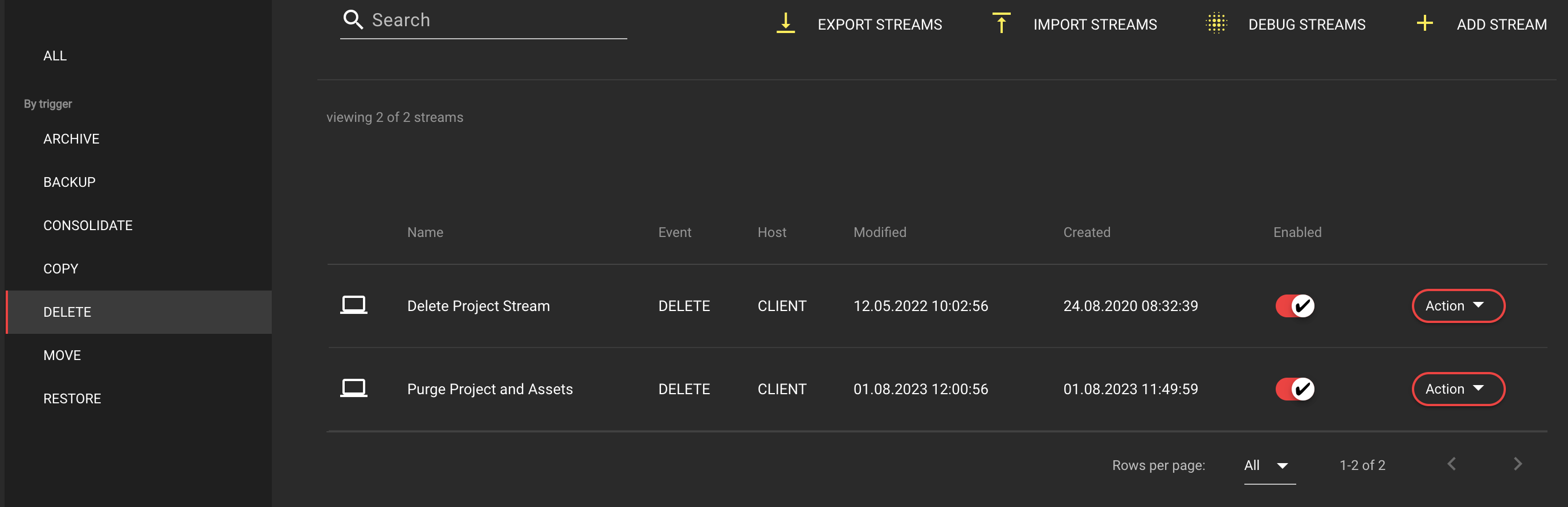 This view shows all trigger-related streams, including their names, host types, modification and creation dates, as well as the status of any stream(s).