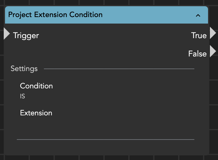 With this conditional node, it is possible to check the extension of a project. If the project's extension matches the string input set within the condition, the node will exit either with a true or false outcome.
