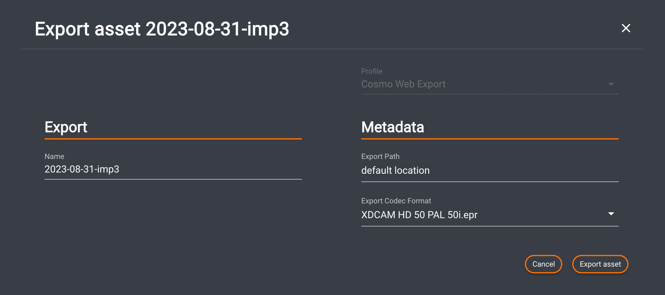 Clicking "Export asset" will start the job. Clicking "Cancel" or the "X" closes the dialog without saving.