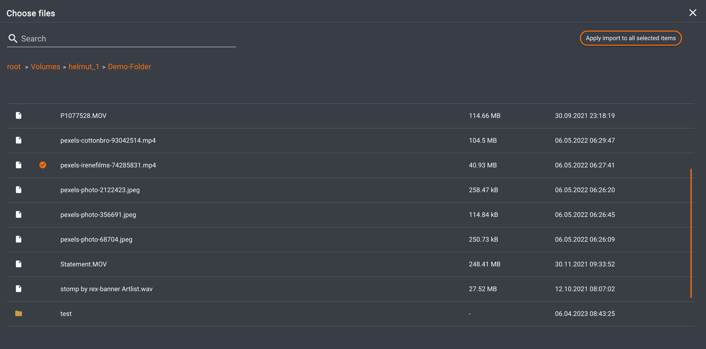 Select the assets to be ingested; the chosen assets will be marked with an orange circle containing a tick. After completing the selection, click the 'Apply import to all selected items' button. The system will remember the last directory used for the next opening.