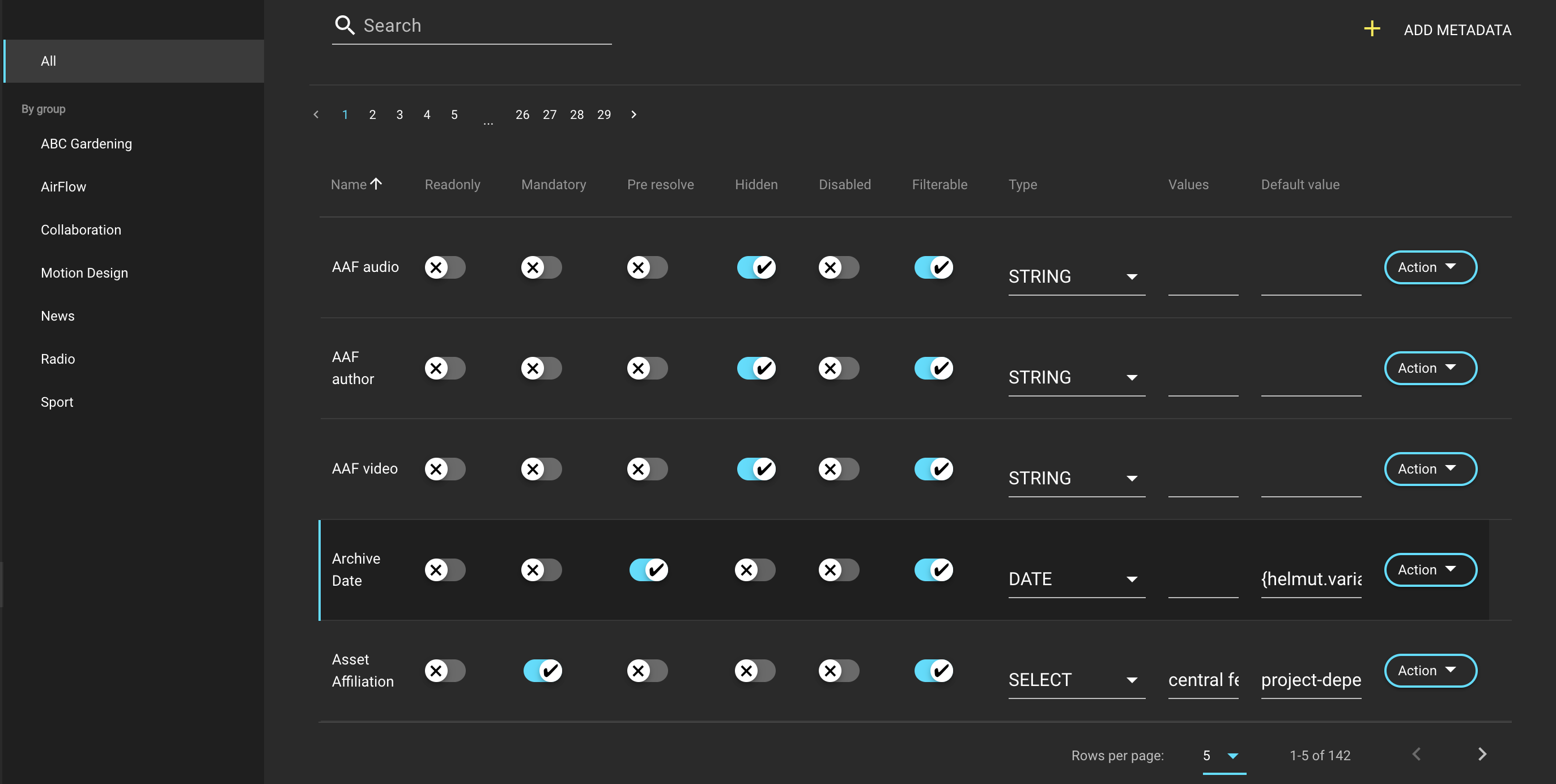 Displays all metadata created in the system and filters the metadata entries displayed in the list view when selecting a group.