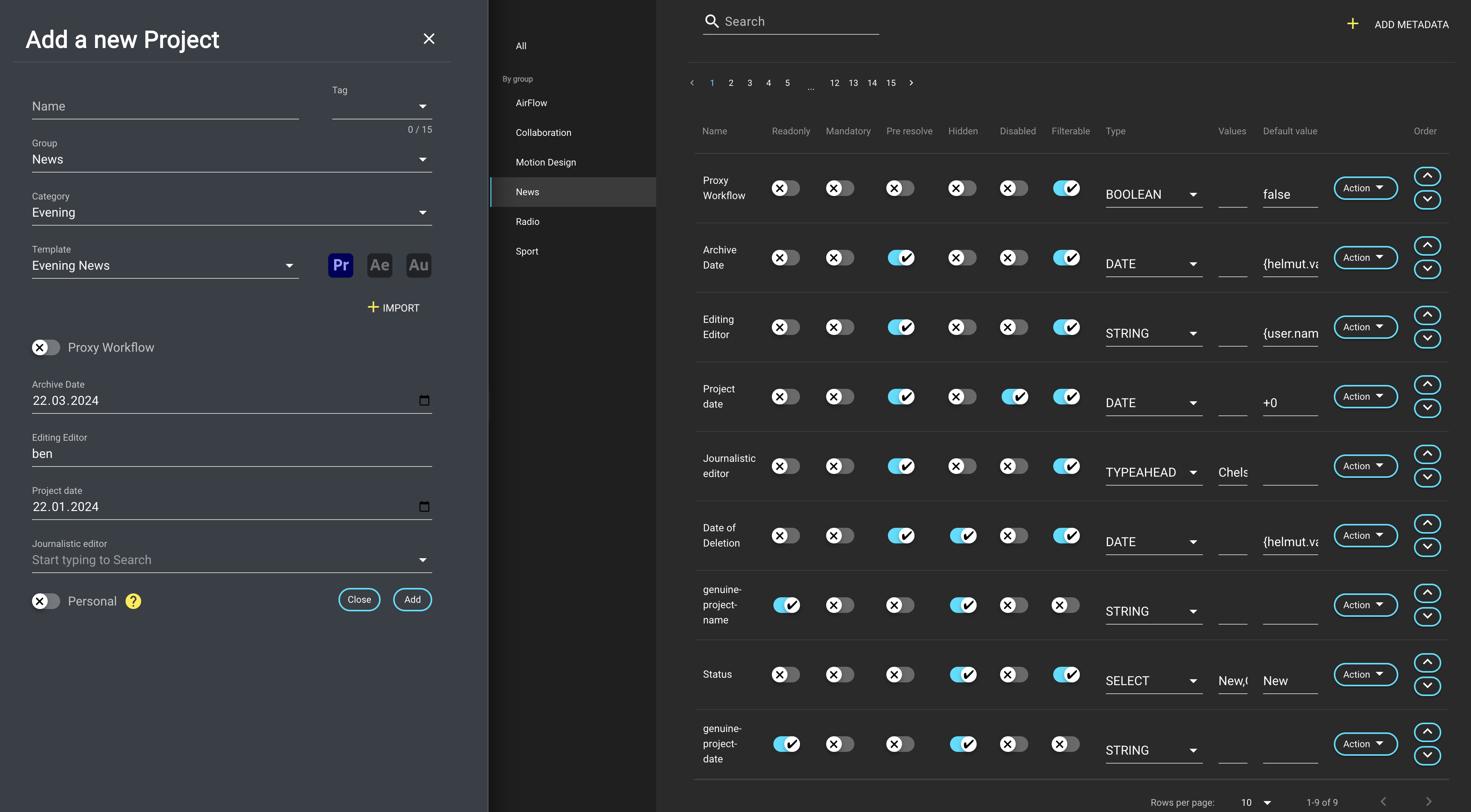 The Metadata menu serves the purpose of managing metadata. It consists of a sidebar menu, a list view, and a concealed overlay. Each entry is unique and cannot be duplicated with the same name. Users can create, edit, and delete metadata, and also assign them to sets.