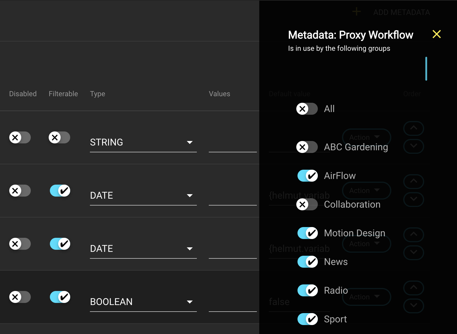 To add metadata to a group, select the desired metadata to open the hidden side menu overlay. Now, choose the group(s) to which it should be assigned.