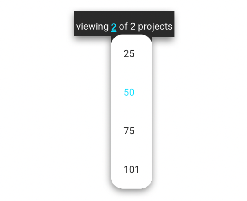 The maximum number of projects shown per page is 25 and can be adjusted by selecting from the options of 25, 50, 75, or 101 elements per page, accessible by clicking on the colored number text.