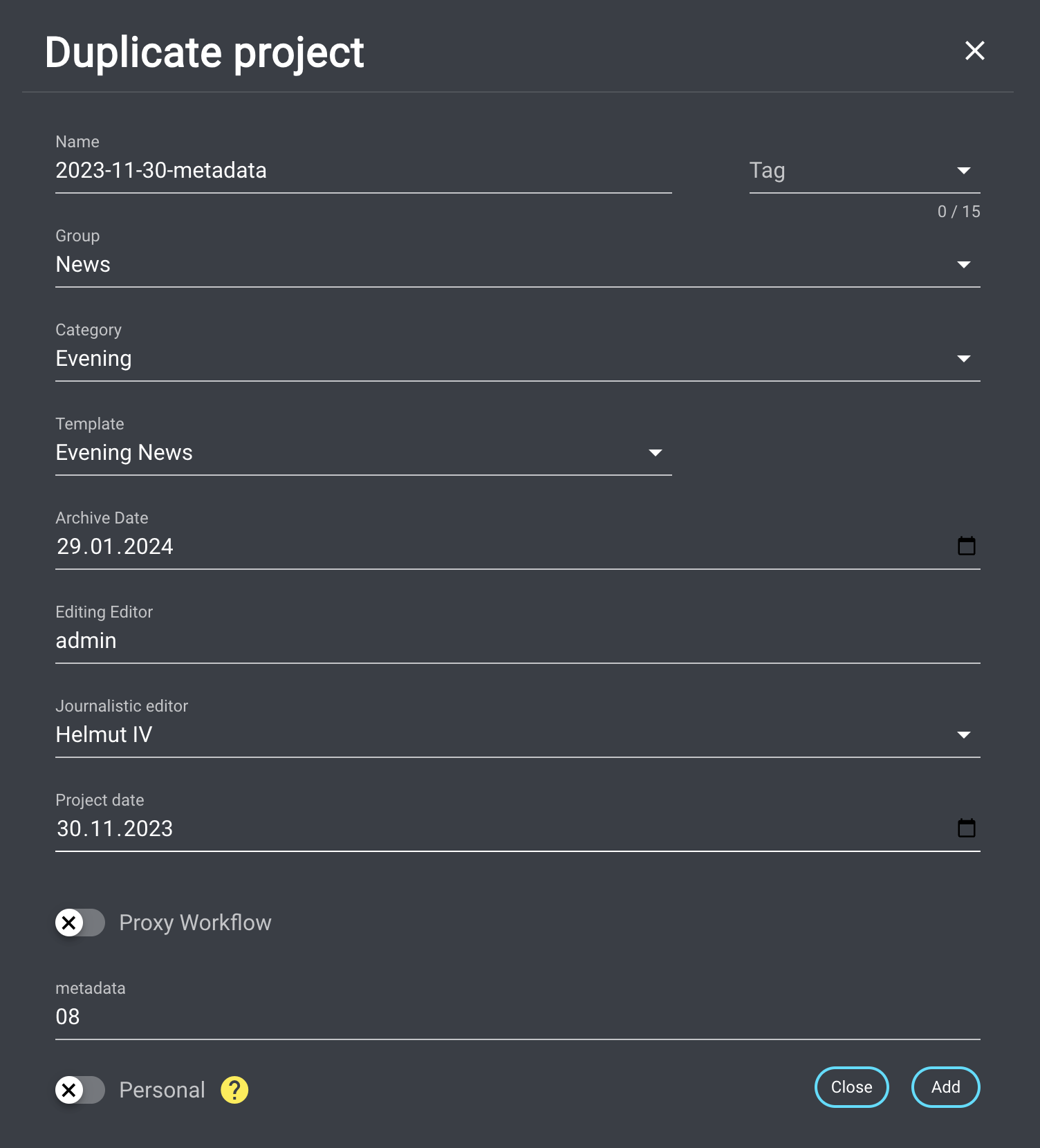 This trigger will activate when a user clicks the 'Duplicate' button in the Action menu. Clicking this button will open an overlay window, enabling the user to set various parameters. These parameters will be utilized to create a duplicate of the source project.