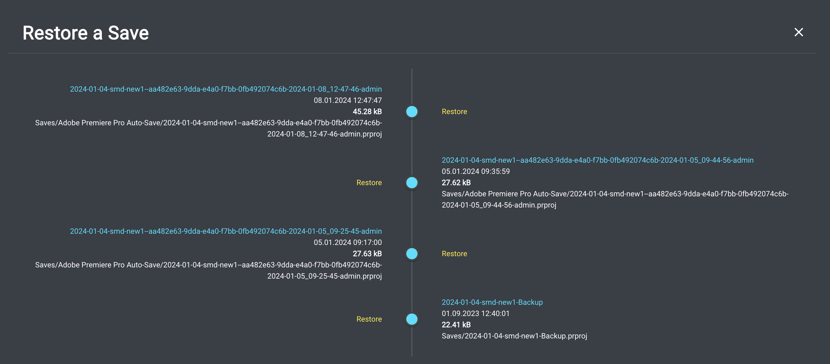 <figure><img src="https://content.gitbook.com/content/JazOaknIWynmzOb8kuKL/blobs/c8tx8qa1taPFR9qN9CcL/image.png" alt=""><figcaption><p>Restore saves overview</p></figcaption></figure>