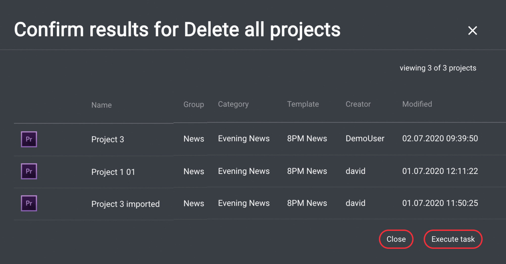 Here, it is possible to execute the selected task based on the defined filter parameters. If executed, jobs are created in the dashboard for all projects found, and the corresponding projects are blocked in the project overview.