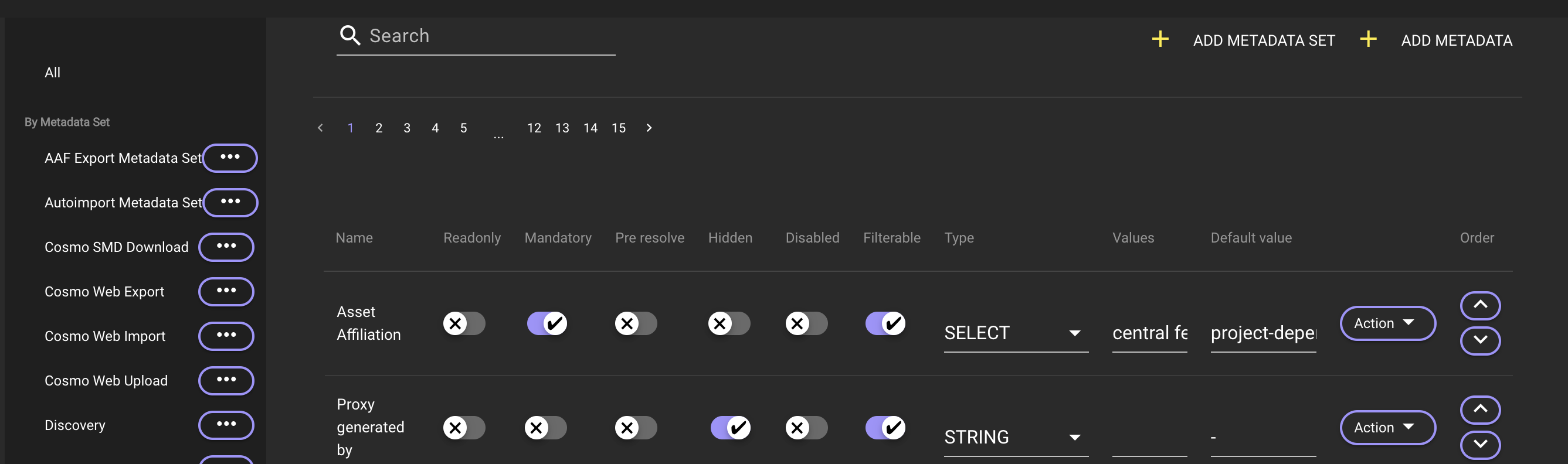 Displays all metadata sets created in the system and filters the metadata entries displayed in the list view when selecting a set.
