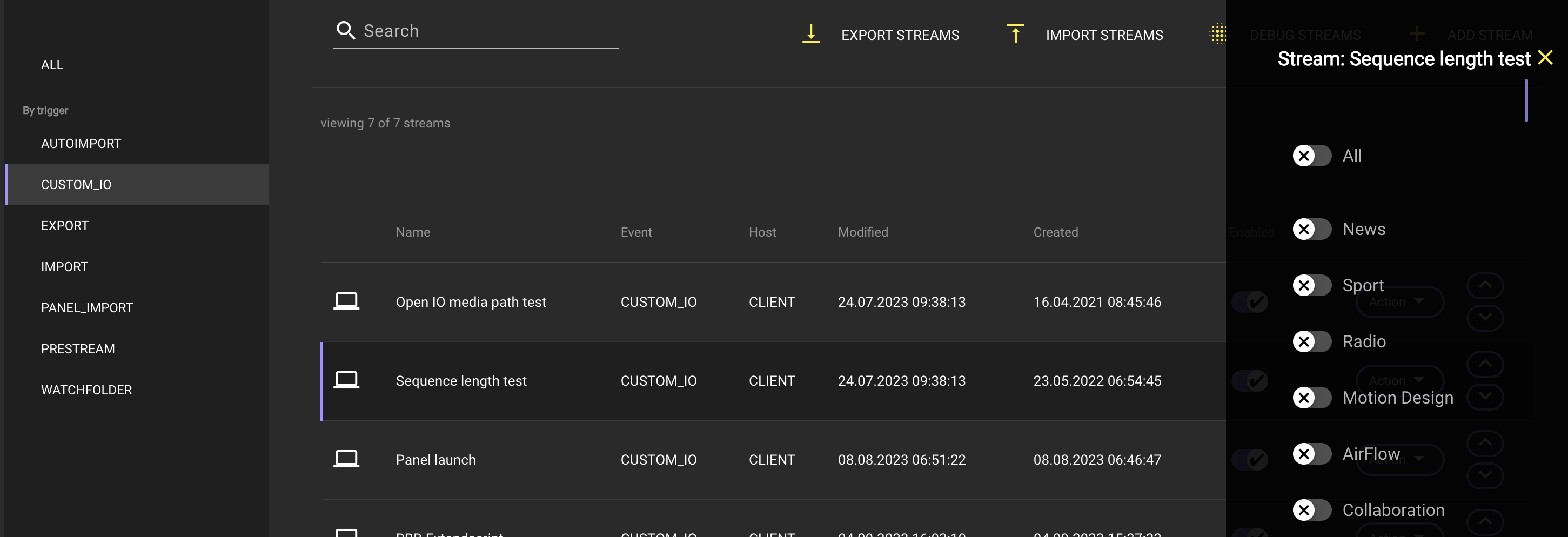 The purpose of the Custom\_IO trigger is to initiate a stream based on sequence, composition, or project criteria. These streams can be executed via the 'Custom IO' menu in the [Helmut4 Panel](https://docs.helmut.de/helmut4-releases/v4.9.0/helmut4-components/helmut4-panel).