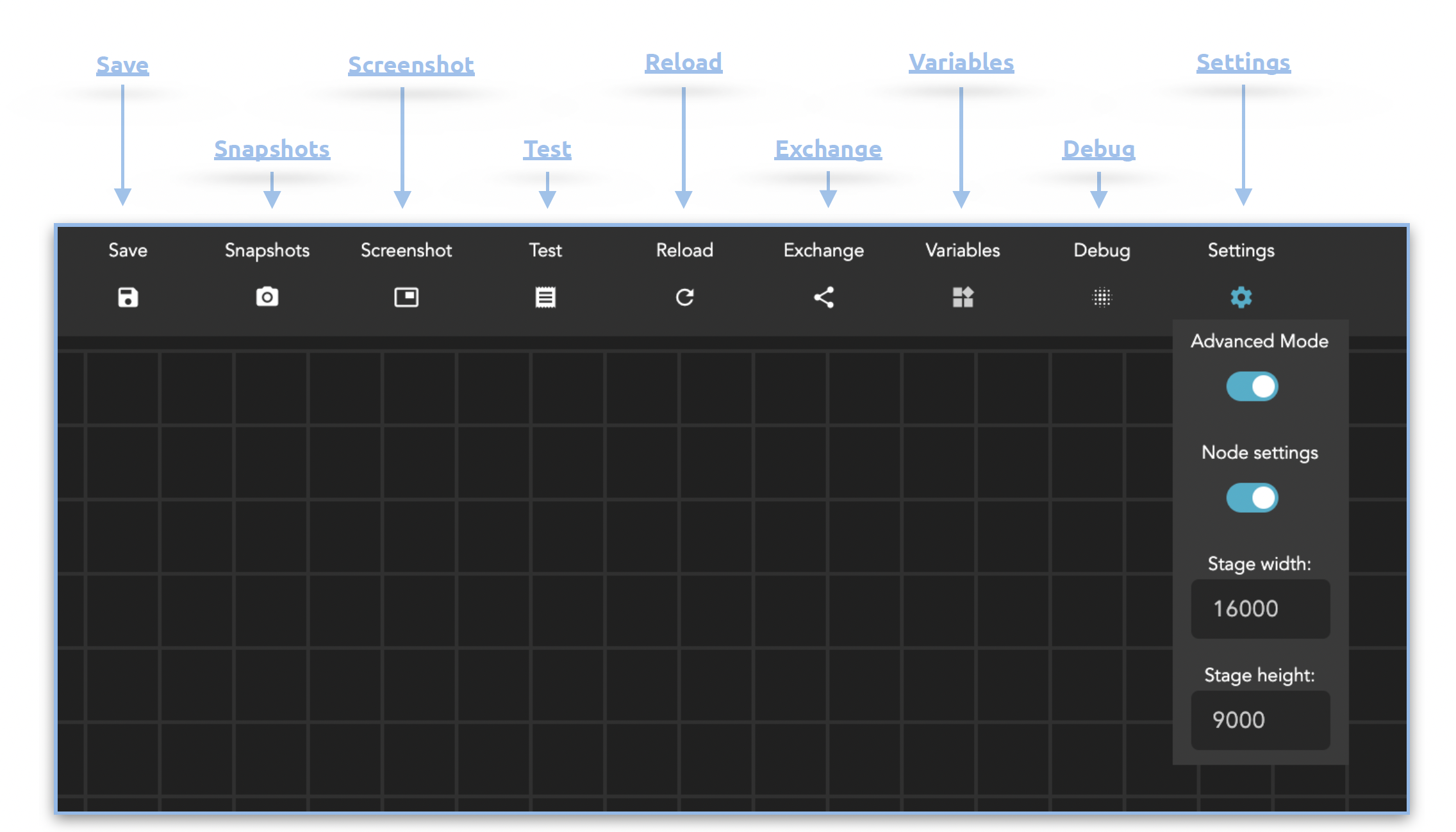 Node Settings: Will hide all node details in the stage to reduce the height to a minimum and hides the option to minimise single nodes.