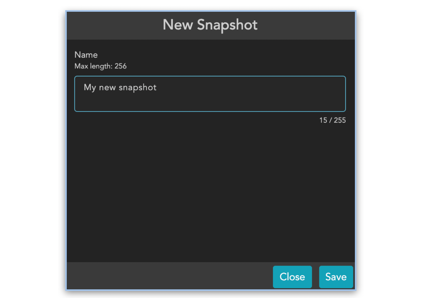 Opens a dialog with which it is possible to add new snapshots. Opens a dialog with which it is possible to add new snapshots. The character length of the name is limited to 255 characters.