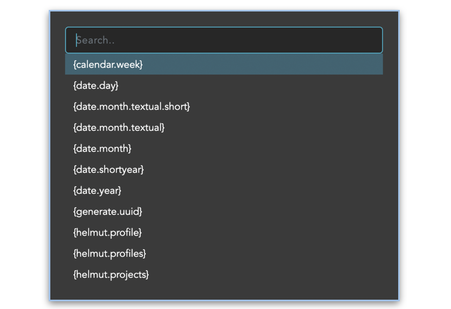 The icon next to the input field opens the placeholder palette. It has a type ahead function and the selected placeholder is placed at the cursor position in the edit field. If the selected wildcard contains a “?" (place holder for, for example, a path or another wildcard), this is automatically highlighted to speed up further processing.