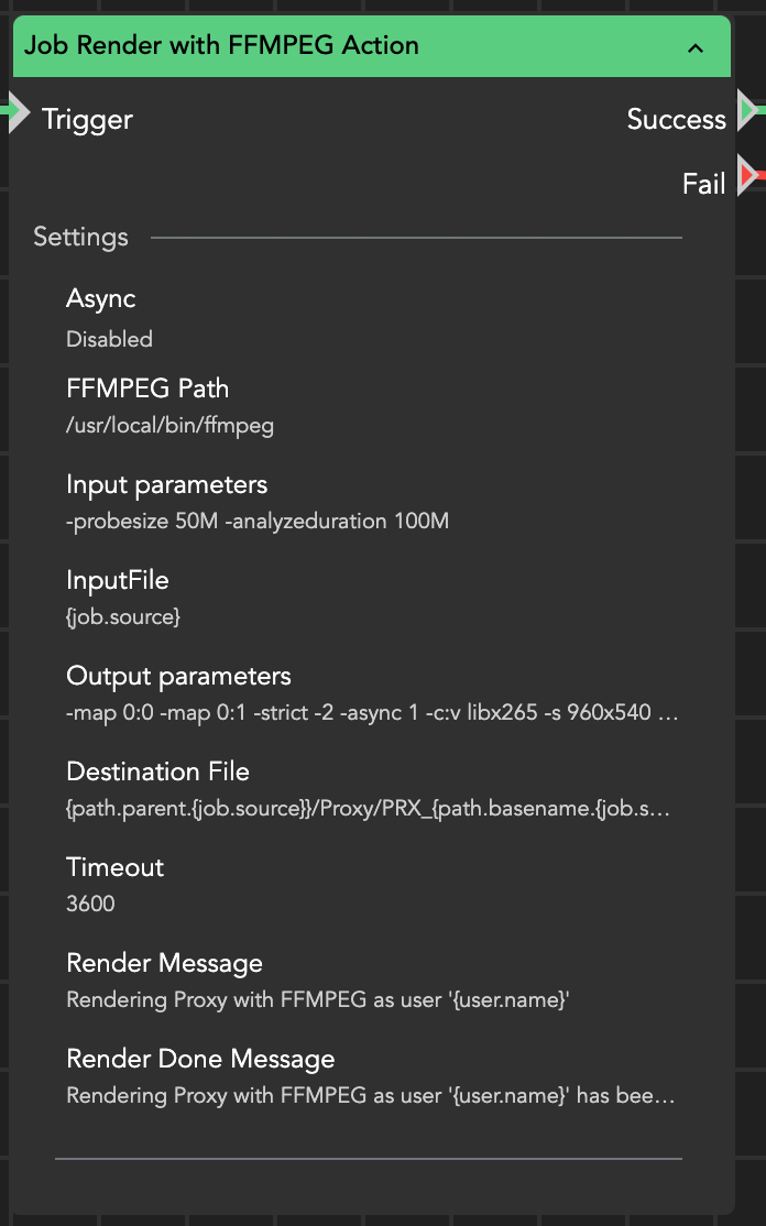 The path to the FFMPEG executable needs to be set, file extension for the input and destination file need to be included. FFMPEG parameters can be set in the input and output . FFMPEG will not count up if the file is already available on the target path. To count up the file name, the File Increment Name Action should be used together with the FFMPEG node. The path for the output file can be accessed via the wildcard {stream.last_result} in the next node in the stream or anywhere in the stream.