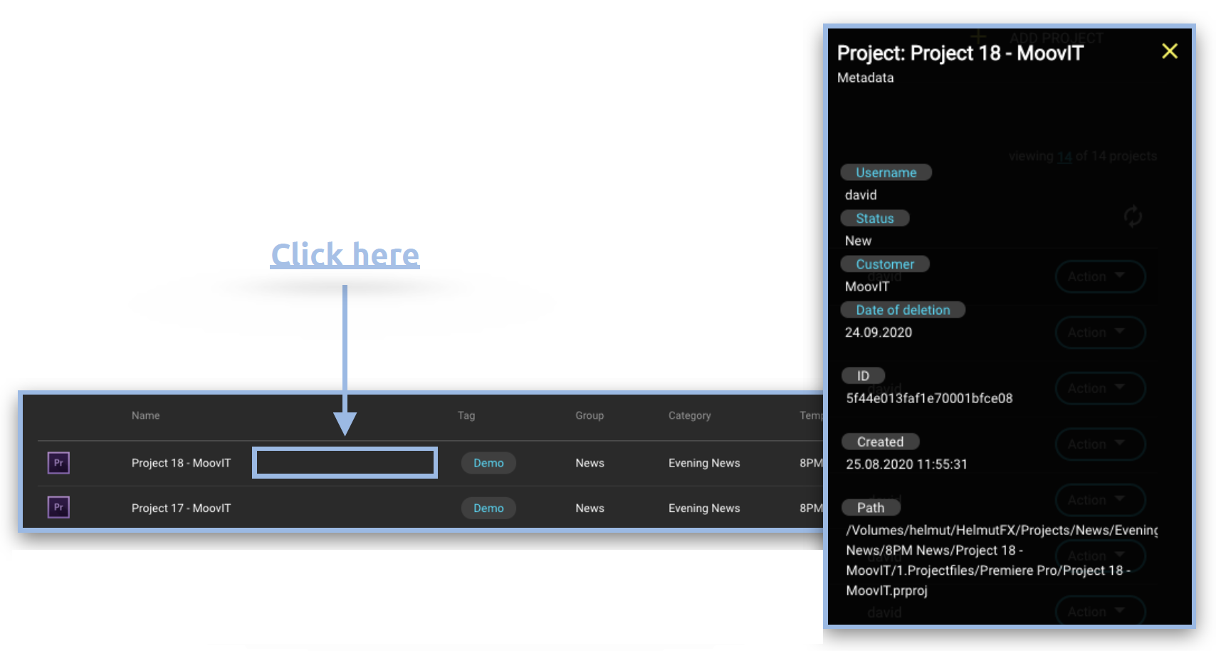 With the help of the Project Metadata Remove Action it is possible to remove a metadata entry that has already been set on a project. This only applies to custom metadata. Custom project metadata is displayed in FX, CO and HK when you click in the project table between the displayed values.