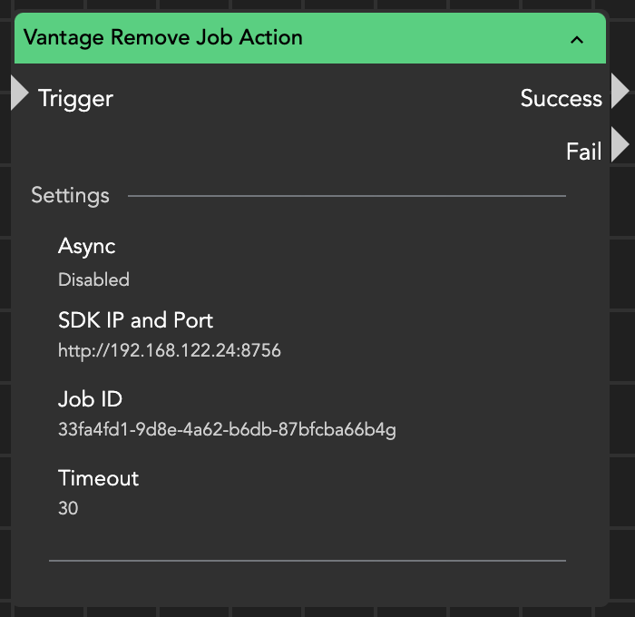 This node facilitates the capability to halt or terminate a running Vantage job by sending the corresponding job ID to the Vantage system. To ensure seamless communication, it is imperative to provide the Software Development Kit (SDK) IP address and port for establishing a successful connection.