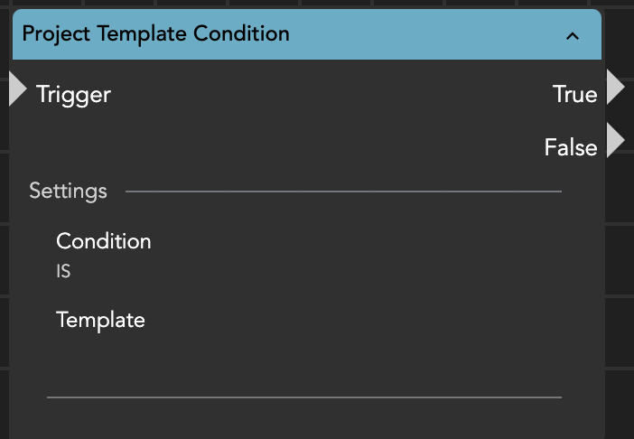 With this conditional node, it is possible to check the assigned template of a project. If the project's template matches the string input set within the condition, the node will exit either with a true or false outcome.