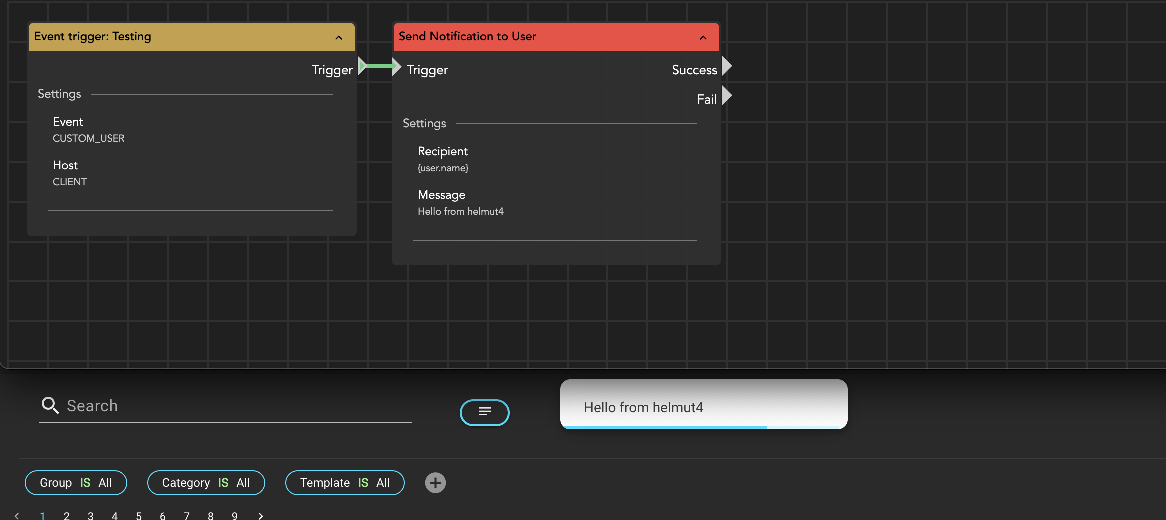 The "Send Notification to User" Action node enables the sending of a notification to a user. The message is visible in the web interface as well as within the panel and will disappear after 10 seconds. This functionality can be utilized, for instance, to update the user on the progress of a workflow that may not be visible on the dashboard.