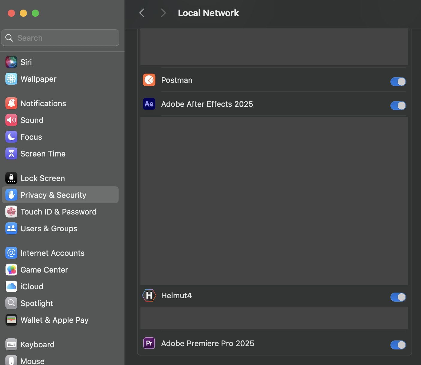 Starting with macOS 15, also known as Sequoia, we recommend granting local network permissions to both the Helmut4 client and Adobe applications (Premiere Pro, After Effects, and Media Encoder).