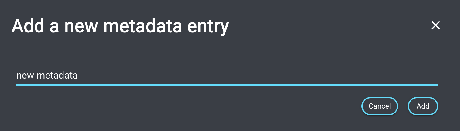 Clicking the button will open an overlay requesting a new metadata name. If an illegal character is used, the dialog will inform you that the character is not allowed. Clicking "X" or "Cancel" will close the dialog, while clicking "Add" will create new metadata based on the defined name.