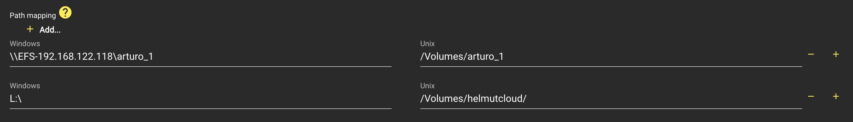 In the path mapping table, you have the option to define system-wide paths for translating between UNC and UNIX paths. To add new paths, click the "+" button located on the right edge under path mapping.