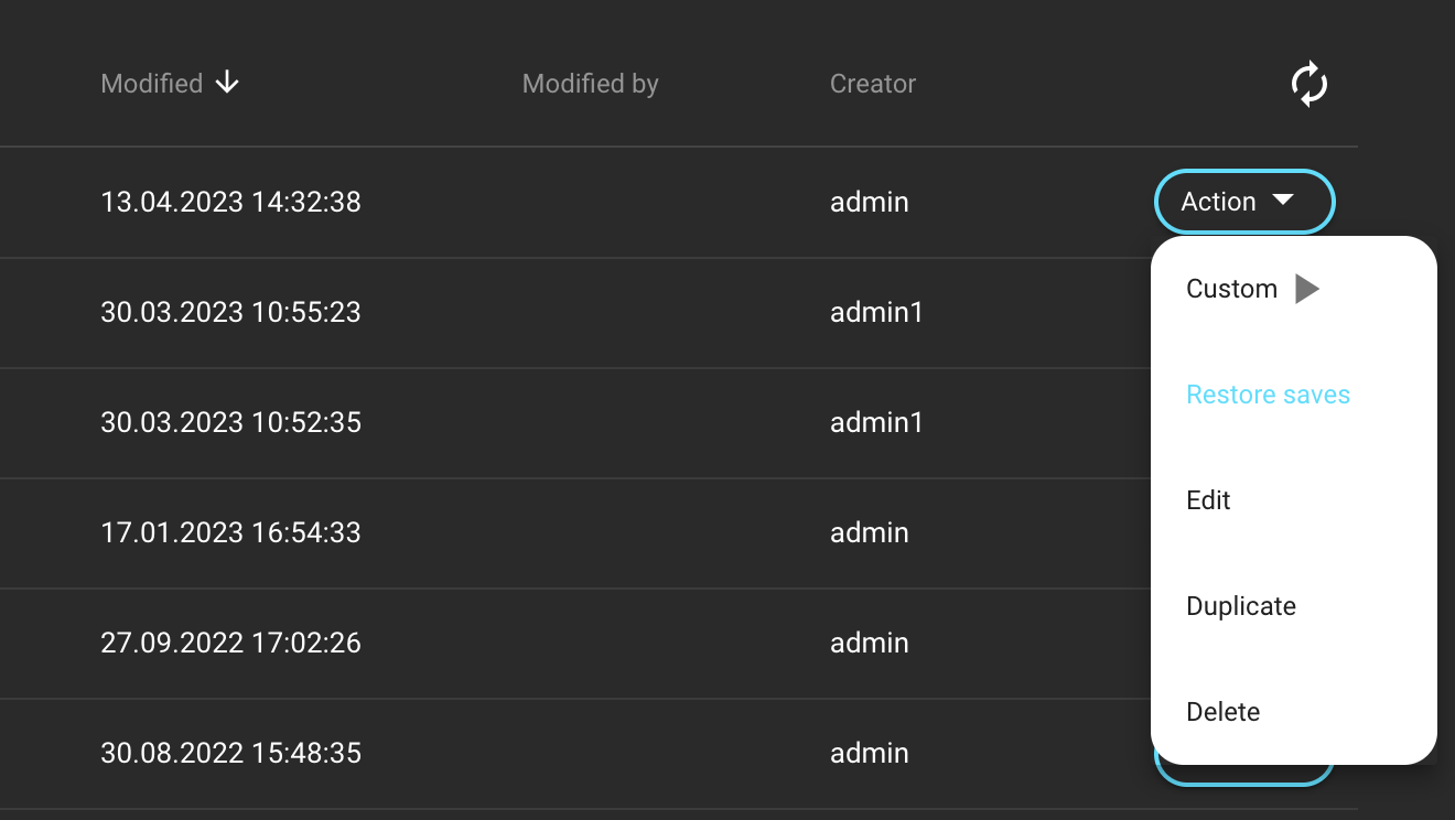 This trigger is activated when a user clicks 'Restore saves' through the Action button menu. It opens an overlay window displaying all the available autosaves.