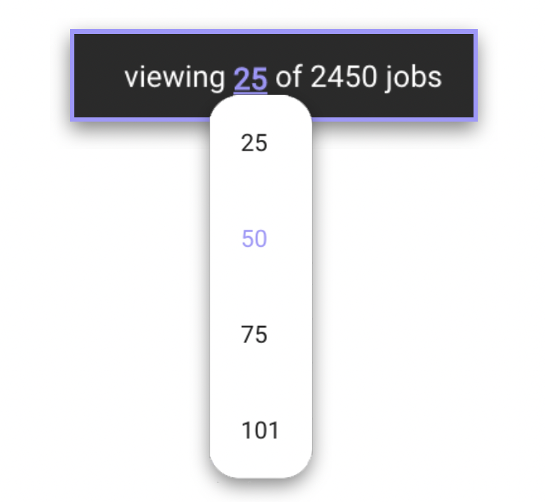 The maximum number of jobs shown per page is 25 and can be adjusted by selecting from the options of 25, 50, 75, or 101 elements per page, accessible by clicking on the colored number text.