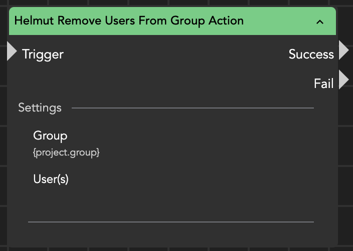 The "Helmut Remove Users From Group Action" node enables the removal of one or multiple users from a specified group. This functionality streamlines user management by allowing administrators to efficiently adjust group memberships as needed within the system.