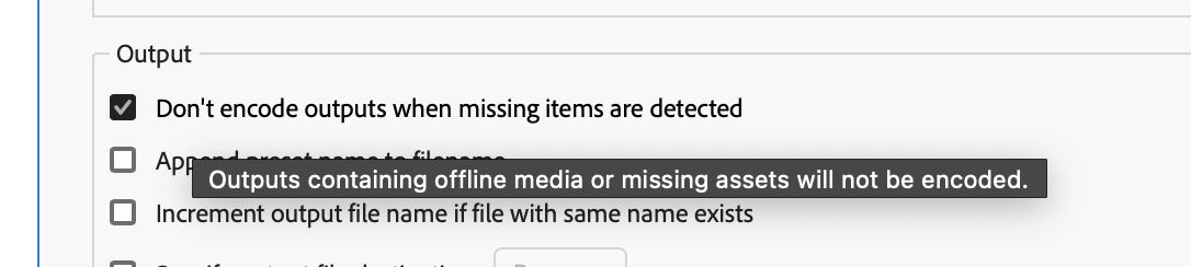 If this option is disabled, AME will still render the sequence or composition even if some elements are offline, resulting in a red, full-frame warning in the exported file.